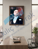Ata 12, Gazi Mustafa Kemal Atatürk’ün kararlılığını ve liderlik ruhunu yalın bir anlatımla öne çıkaran özel bir posterdir. Kılıç Bayrak kalitesiyle üretilen bu çalışma; kumaş ve vinil seçenekleriyle sunulur. Standart ölçüsü sayesinde sınıflar, resmi daireler ve kurumsal alanlarda düzenli ve dengeli bir görünüm sağlar. Dayanıklı baskı yapısı ve net görüntüsü ile uzun süreli kullanım için uygundur.