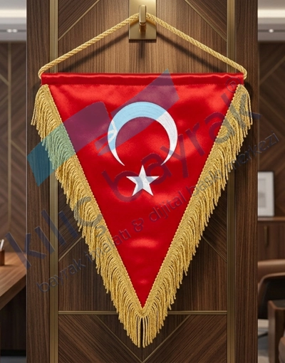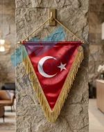 Altın saçaklı üçgen takdim Türk bayrağı, dekoratif ve resmi kullanım için idealdir. Parlak kumaşı ve şık püskül detayları ile makam odaları ve kurumsal alanlarda prestijli bir görünüm sunar.