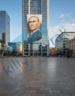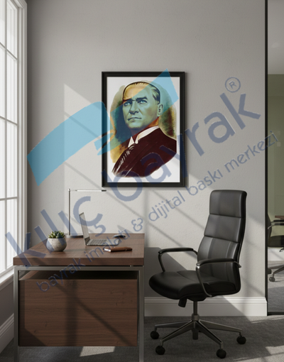 Ata 11, Mustafa Kemal Atatürk’ün devlet adamı kimliğini ve Cumhuriyet değerlerine olan bağlılığını yansıtan seçkin bir poster çalışmasıdır. Kılıç Bayrak tarafından özenle üretilen bu ürün, kumaş ve vinil seçenekleriyle sunularak farklı kullanım alanlarına uyum sağlar. Standart ölçüsü sayesinde ofisler, kurum binaları, okullar ve sergi alanlarında rahatlıkla tercih edilir. Dengeli renk dağılımı ve net baskı yapısı ile mekâna sade ama güçlü bir etki kazandırır.